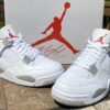 Combining the silhouette’s “Oreo” and “White/Cement” colourways, the Air Jordan 4 Retro “White Oreo” sneakers boast a monochrome design. Speckled grey detailing appears alongside the pair’s white “wings” whilst the Jumpman motif stands out in a bold Fire Red